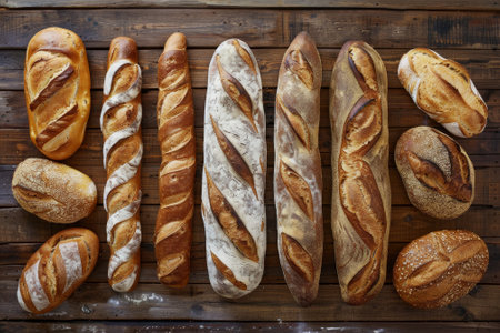 Row of Artisan Baguettes on Wooden Table
