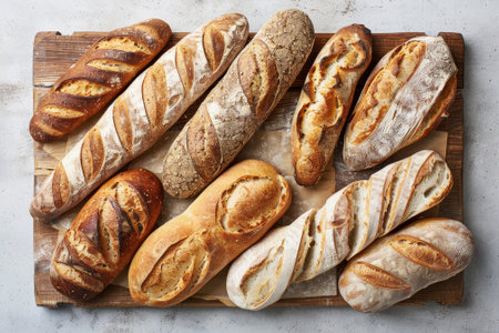 A beautiful arrangement of artisan bread loaves on a sleek white marble surface, highlighting their golden crust and inviting texture, perfect for culinary presentations.