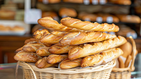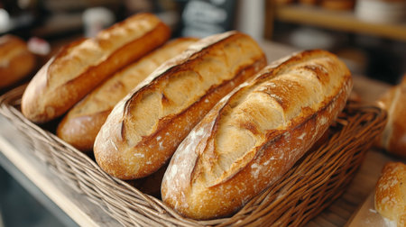 A beautiful arrangement of freshly baked baguettes placed in a rustic wicker basket, highlighting the warm golden crust and inviting aroma, perfect for any meal.