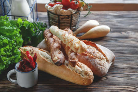 An assortment of different types of bread. Italian ciabatta bread, grissini with tomatoes, milk and olive oil on a rustic table