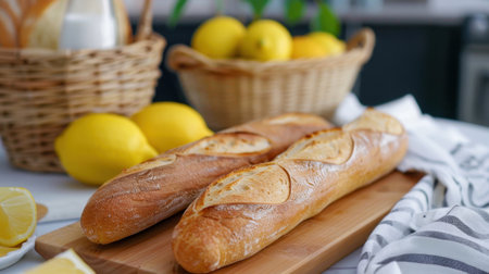 Discover the warmth of freshly baked baguettes paired with vibrant lemons in a rustic kitchen setting. Perfect for culinary inspiration and cozy meals.