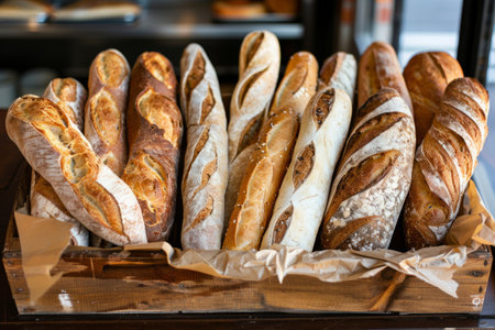 A collection of freshly baked rustic baguettes sits on a wooden rack in a cozy bakery, showcasing their warm hues and rustic textures under soft lighting.
