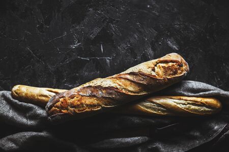 French fresh bread baguettes on a dark background