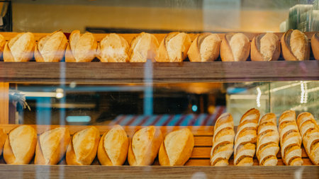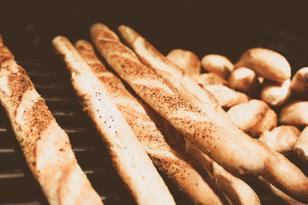 French Baguettes in bakery store. Freshly baked loaves on bakery racks. Baked goods and bakery context. Tasty french baguettes arranged in rows in bakery.