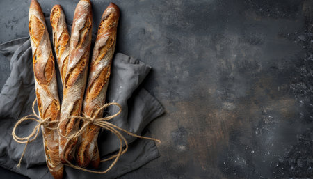 Baguettes tied up with string on table with empty space. unaltered, healthy food, french food and baked food.