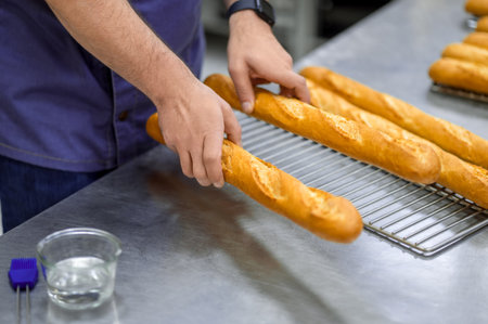 Unrecognizable man baker baking baguettes in bakehouse