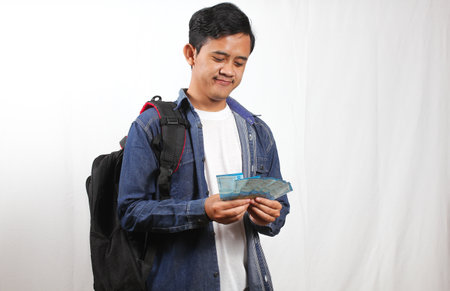 Candid Young Adult Student Counting Indonesian Rupiah Currency Money Bills