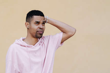 Portrait of pensive Afro American guy touching his chin, looking away and thinking, on gray background