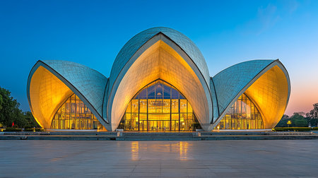 Modern Architectural Masterpiece, A Lotus Temple Illuminated at Sunset, New Delhi, India.