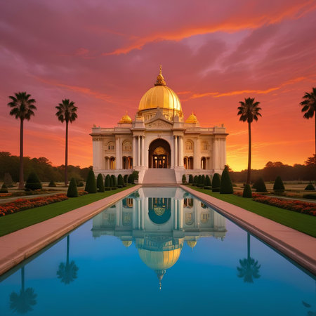 scenic mosque courtyard with beautiful architecture, lush gardens, and a peaceful atmosphere.