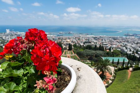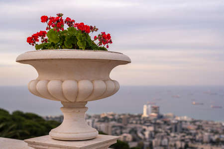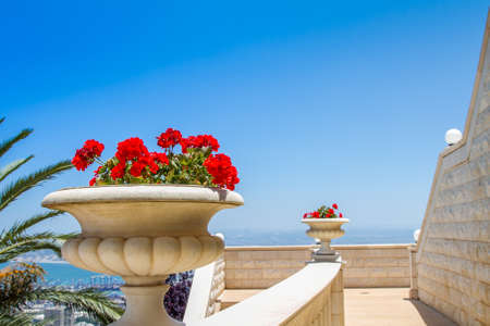 Flower pot with geranium plant at the Bahai Garden entrance above the Bahai Temple in Haifa, Israel