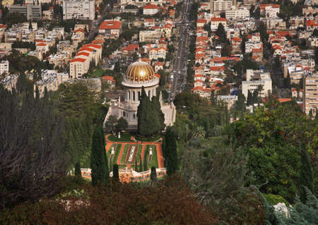 View of Haifa from the hill. Partly visible gardens of the Bahai (Shrine of the Bab), a holy pilgrimage for the Bahai believers built on Mount Carmel in Haifa, Israel.