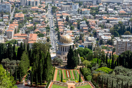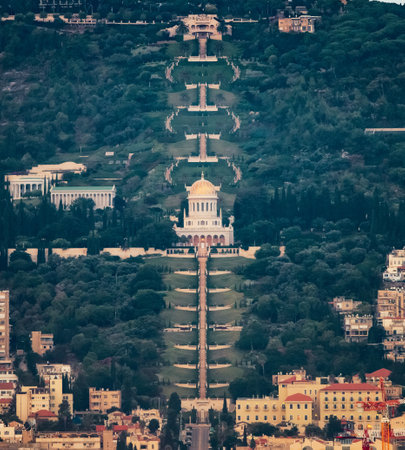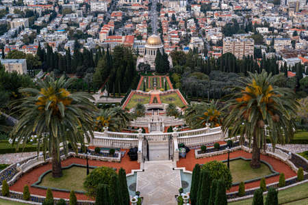 Beautiful panoramic picture of the Bahai Gardens in Haifa Israel. View from a height of a staircase with terraces extending all the way down the golden-domed Shrine The beauty of Haifa
