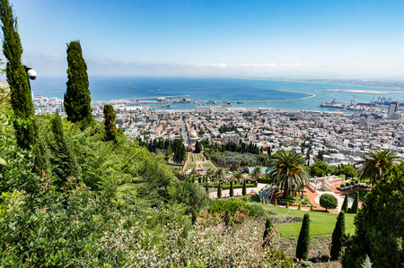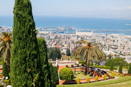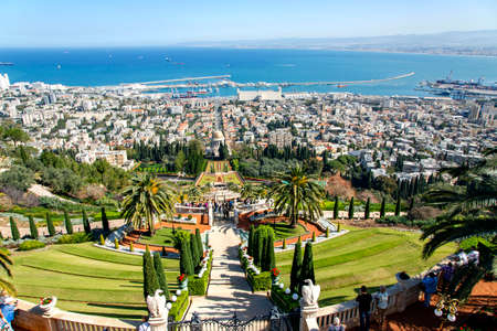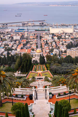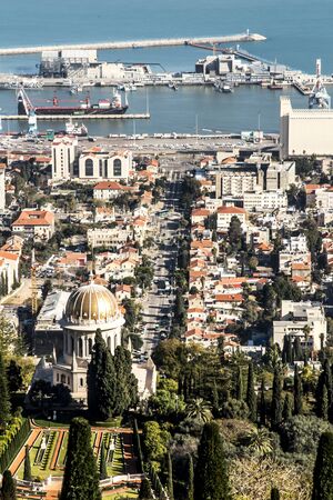HAIFA, ISRAEL - MAY 6, 2017: Pilgrimage center and popular tourist destination. Bahai World Center. Sunny day by Mediterranean Sea. View from Mount Carmel to the seaport of Haifa.