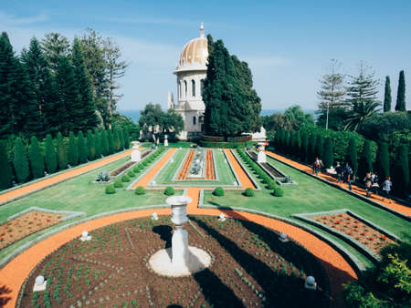 ISRAEL, HAIFA, MARCH, 20, 2016 - A amazing view of the Bahai beautiful gardens with a white temple in the center, Haifa, Middle East, Israel