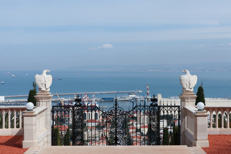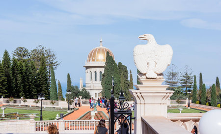 Haifa, Israel - November 19, 2016 : Eagle statue and Temple in Bahai Garden in Haifa, Israel