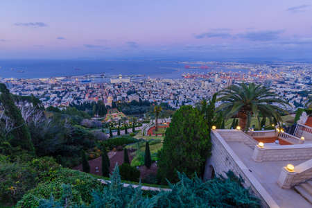 Sunset view of the Bahai Shrine and gardens, with the downtown and the port, in Haifa, Northern Israel