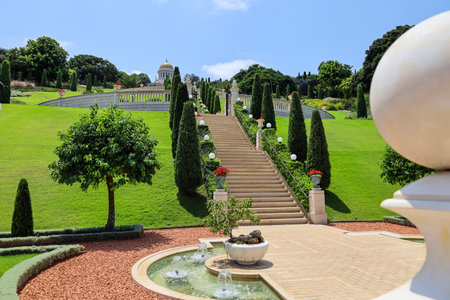 Magnificent marble fountain. Staircase and picturesque colonnade with a gilded dome on the Mount Carmel, Haifa. Israel. Bahai World Center. The descent to the Mediterranean Sea. Clear sunny day