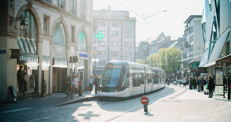 Basel, Switzerland - June 9, 2016: Stadler Tango tram in the city centre of Basel.