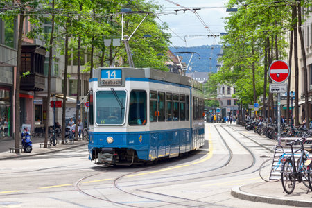 Zurich, Switzerland - June 12 2018: Tramway of the Line 14 circulating in the streets.