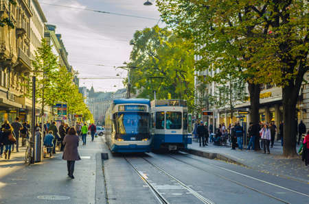 ZURICH, SWITZERLAND, OCTOBER 25, 2015: Traffic and shopping mall on Bahnhofstrasse in Zurich, Switzerland. Bahnhofstrasse is one of the most expensive shopping streets in the world.