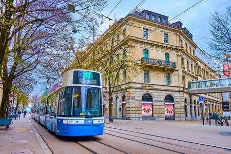 ZURICH, SWITZERLAND - APRIL 3, 2022: The modern tram on Bahnhofstrasse avenue, on April 3 in Zurich, Switzerland