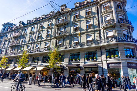 Zurich, Switzerland - 31 October, 2016: Hotel Schweizerhof building facade, view from Bahnhoplatz square