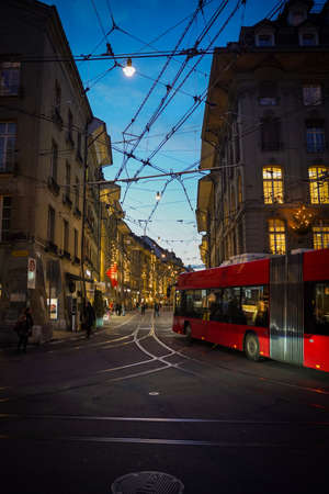 Bern, Switzerland - February 23, 2012: View from the Clock Tower to the tram passing by the street in Bern, Switzerland.