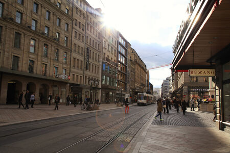 STRASBOURG, FRANCE - APR 3 2017: Busy center of the French city of Strasbourg, Alsace with tramways and commuters pedestrians walking under architectural station l'Homme de Fer on a sunny evening with sun flare