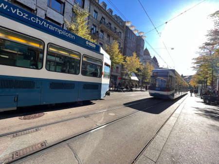 Zurich, Switzerland 10 23 2021 Two trams passing past each other in opposite directions on the main shopping street, Bahnhofstrasse, Zurich. Typical atmosphere in Zurich on Saturday.