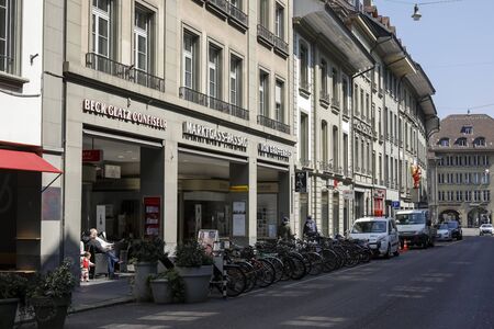 Bern, Switzerland - April 15, 2019: There are medieval tenement houses in the town. Bicycles and cars have been parked on the roadway along these tenement houses.