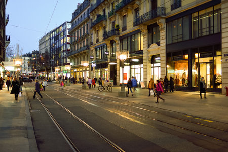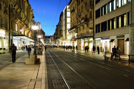 GENEVA, SWITZERLAND - NOVEMBER 18, 2015: streets of Geneva at night. Geneva is a global city, a financial center, and worldwide center for diplomacy due to the presence of numerous international organizations.
