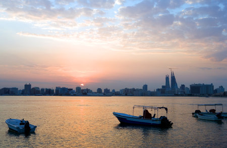 Boats and cityscpae view in the fisherman's bay in Manama Bahrain