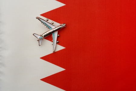 Plane over the flag of Bahrain the concept of travel and tourism. Toy plane on the flag in the background.