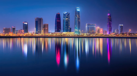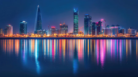 Manama's modern skyline at night, with Bahrain Bay in the foreground, reflecting the city vibrant nightlife and architecture.