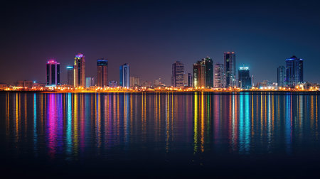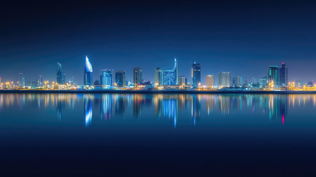Nighttime cityscape of Manama along Bahrain Bay, with the city lights creating a mesmerizing reflection on the water.