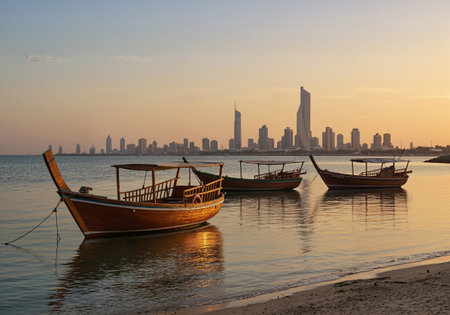 Three traditional wooden dhow boats float peacefully on calm water during a golden sunset with the modern skyline of Kuwait City visible in the distance