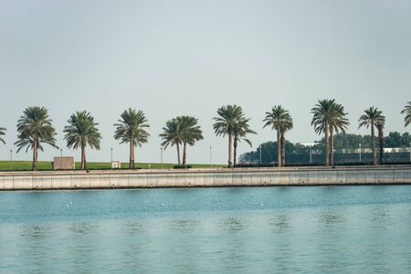 View of city with towers and skyscrapers from Saadiyat Island in Abu Dhabi, United Arab Emirates. View from water surface.