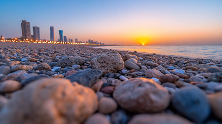 A low-angle shot of a pebble-covered beach at sunset, with buildings in the distance and the sun setting over the water.