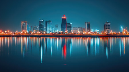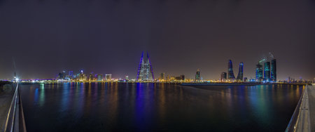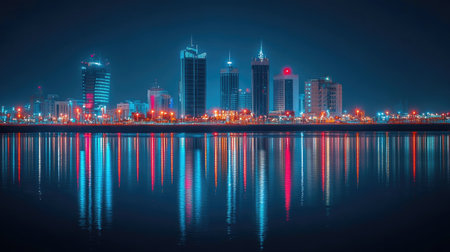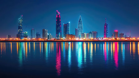 Night view of the illuminated skyline of Manama Bahrain with colorful reflections on the calm water surface