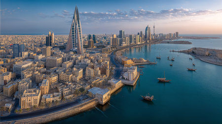 A stunning aerial view of Manama, Bahrain, showcasing the Bahrain World Trade Center, modern skyscrapers, traditional boats in the harbor, and a scenic coastline under a golden sunset.