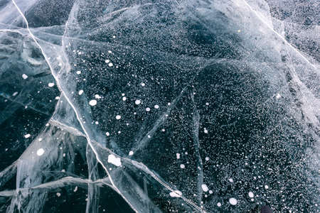 Texture of beautiful blue ice with cracks and air bubbles in the frozen lake. Winter nature abstract background. Lake Baikal, Siberia, Russia.