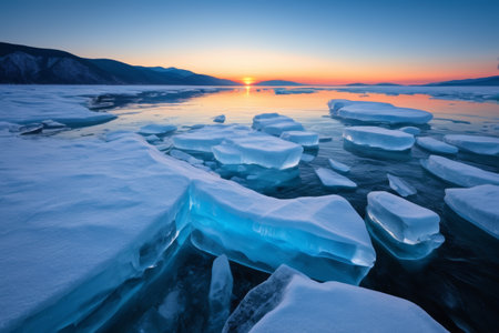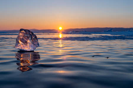 Beautiful winter landscape with frozen Lake Baikal at sunset.