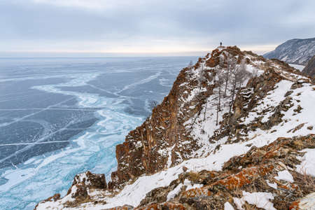 Lake Baikal at winter. Man standing on a edge of cliff and looking at frozen Baikal lake. Deepest and largest fresh water lake. Olkhon Island, Russia, Siberia.