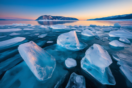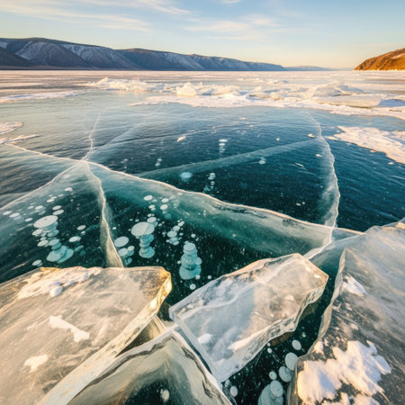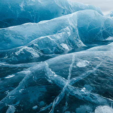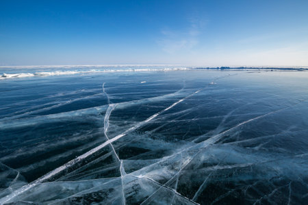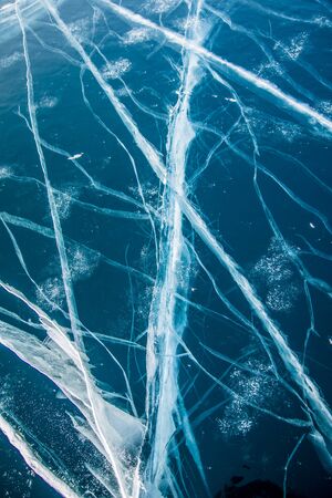 Ice of Lake Baikal, the deepest and largest freshwater lake by volume in the world, located in southern Siberia, Russia