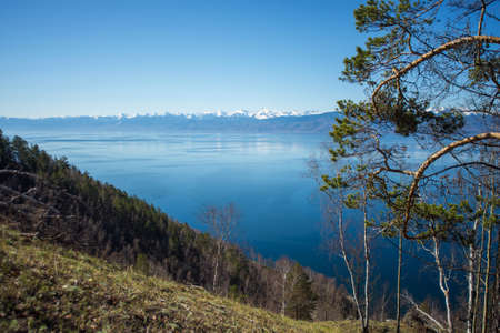 North of Olkhon Island in spring on a sunny warm day. Beautiful view of the mountains, larch forest, Lake Baikal during the melting of the ice.