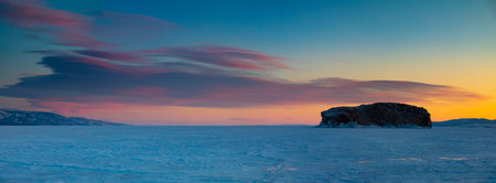 Sunset scene at cape of Burkhan (Shaman Rock) with frozen ice Lake Landscape. Lake Baikal, Russia
