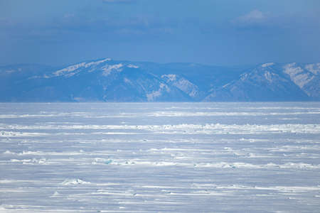 Frozen lake against the backdrop of snowy mountains. Snowy landscape of Lake Baikal.