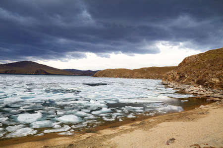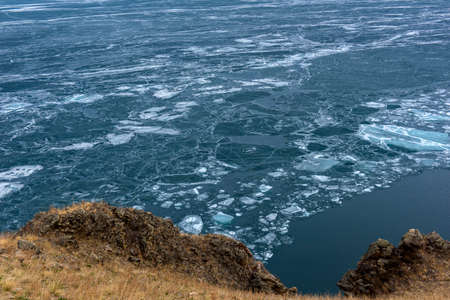 Spring landscape of Lake Baikal on a cloudy day. Ice drift, large ice floes floating in the lake.