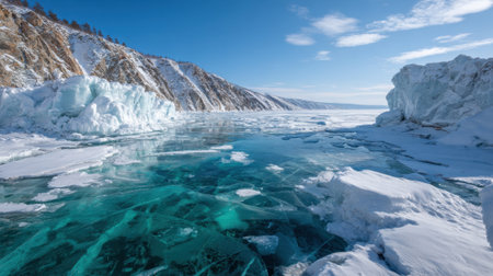 Scenic view of beautiful turquoise ice floes covering lake Baikal surface with snow capped mountains on background during winter season